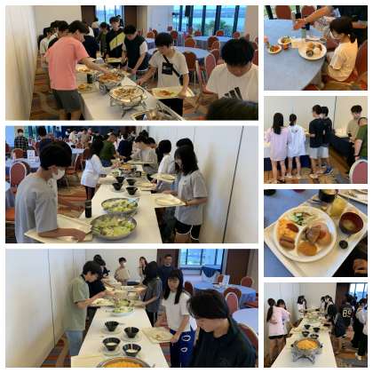 朝食の様子です。2日目は、午前中にマリン体験(バナナボート)を行った後、入市式を行い、午後からは民泊体験となります。