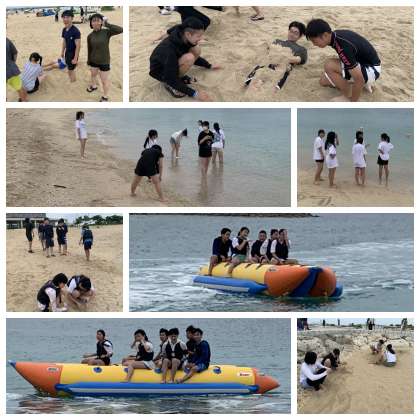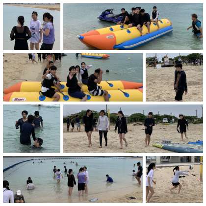 マリン体験では、バナナボート以外にもビーチバレーや貝殻集めなど、砂浜でもたくさんの活動をしています。