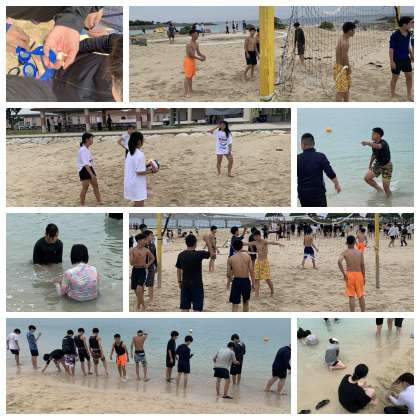 また、先生たちも一緒に海に入ったり、砂浜で遊んだりしています。普段の学校生活では、なかなか一緒に遊ぶことはないので、とても楽しそうですね。