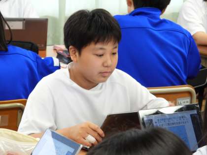 1年3組のEさん。数学の時間、応用問題で魔方陣を作成した際、グループで一番最初に問題を解くことができたようです。達成感満ちあふれた笑顔は「きらり☆」ですね。