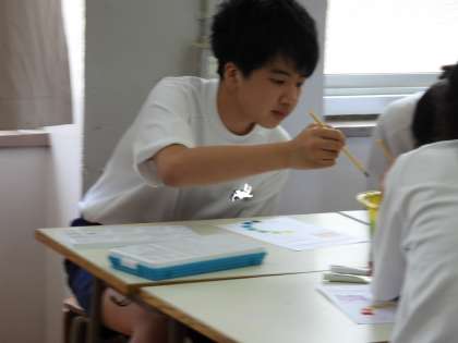 1年3組のKさん。美術の授業で色彩作りをおこなっており、教科書を参考にしながらイメージに近い色を作っていました。そのこだわりに「きらり☆」ですね。