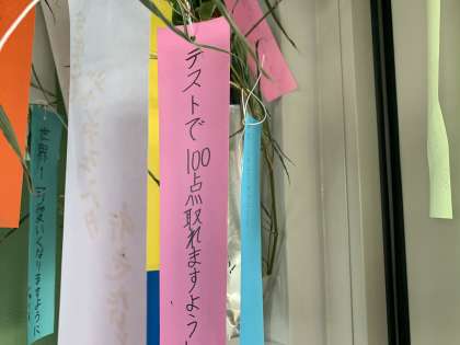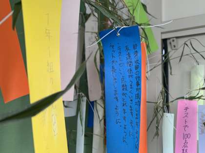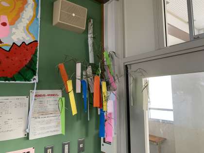 週末の日曜日は七夕です。1年生のとある教室には笹に短冊が飾ってありました。
