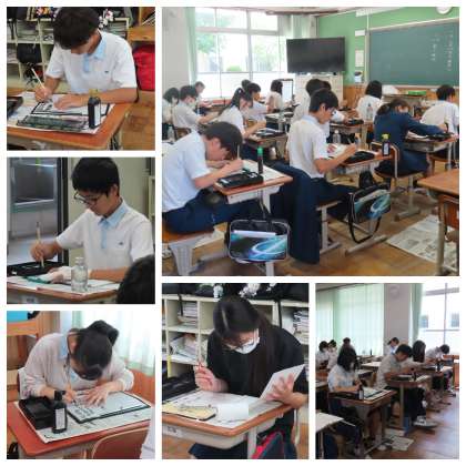 先日、自分たちで作った俳句を、小筆で一生懸命書いていました。