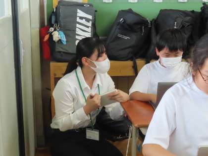 今日から、インターンシップの学生が1名来てくれています。早速、1年生の教室に入り、授業のサポートをしてくれていました。