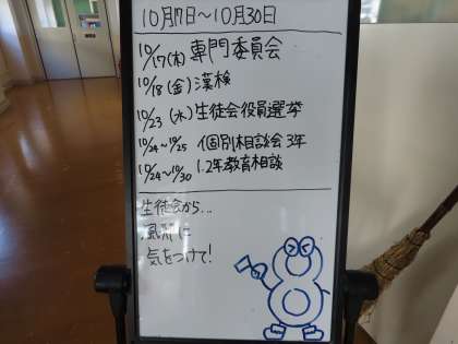 今週は、漢字検定や生徒会役員選挙など、たくさんの行事が行われます。また、個別懇談会や教育相談などもあります。