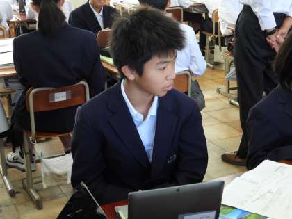 先日まで生徒作品が展示されていました。1年3組Sさんの美術で作成した文字イラストはうまく工夫されていました。その発想に「きらり☆」ですね。