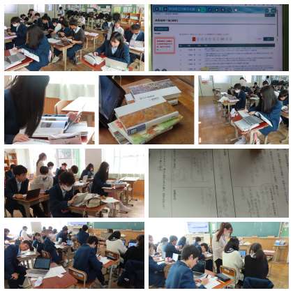 3年生国語の授業では「和歌」の学習をしています。今回は「万葉集」「古今和歌集」「新古今和歌集」の学習をした後、自分の好きな和歌をタブレットや本から探し、それについて個人やグループで調べ、鑑賞文を書く学習をしていました。