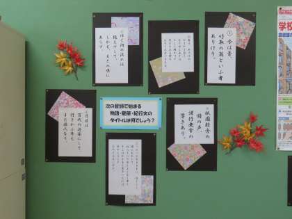 図書室には、古典の日にちなんで「冒頭文クイズ」が掲示されています。授業で習ったものや、有名なものが掲示されています。ぜひ、挑戦してみてください。