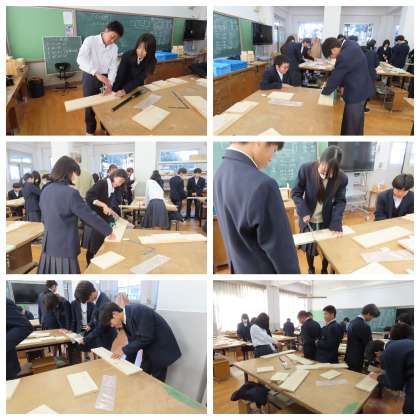 1年生の技術では、ラック製作に取り組んでいます。一枚の板から寸法を測って、それぞれがデザインしたラックを作っています。普段、なかなか使うことのないノコギリに悪戦苦闘していますが、素敵なラックができるのが楽しみですね。また、友達が作業しているのをサポートする姿も見られました。