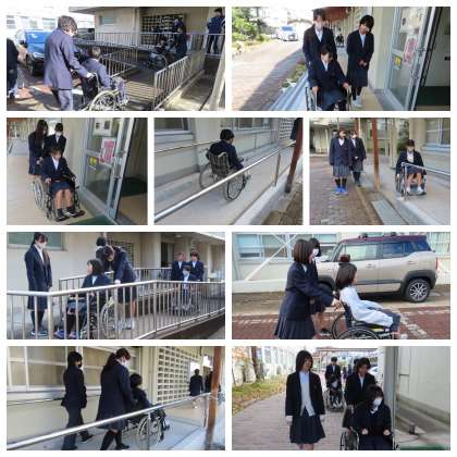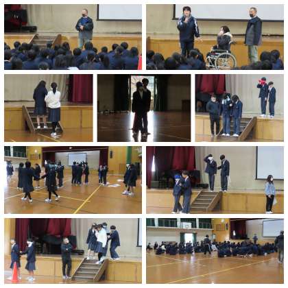 1年生では、2・3時間目に「人権学習」を行いました。先週に事前学習を行い、今日は実際に車椅子やアイマスクの体験を行いました。