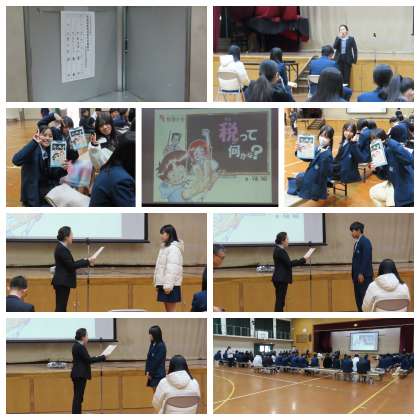 5時間目は「税金」についての講義をしていただきました。税金の役割や使い道について確認した後、税金の集め方についても考えました。また、講義に先立って、「税の作文」の表彰を下京税務署 副署長からしていただきました。