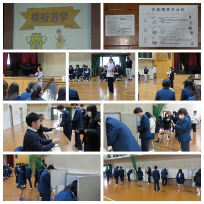 6時間目は、「選挙」について学習しました。先生たちが立候補者となって演説をした後、その演説を聞いた一人一人が投票用紙を受け取り、投票を行いました。今回は、投票用紙も本番で使用するものを使い、記載台や投票箱も使って投票を行いました。生徒たちは、少し緊張した表情で記載台に向かい、投票を行っていました。また、開票作業も代表生徒が行い、実際の投票の様子を知ってもらえたのではないでしょうか。