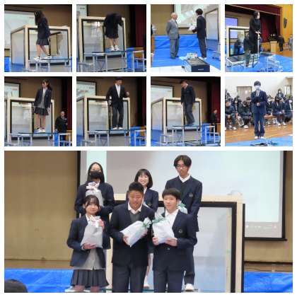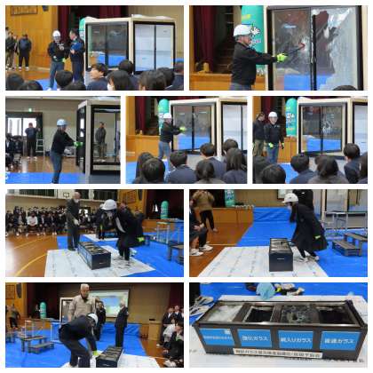 夏休みに、体育館の全てのガラスを交換しましたが、どんなガラスに交換されたのか、どんな機能があるのか などについて、先日テレビでも紹介されたものなどを使って、ガラスが割れる様子や違いなどを見ることができました。生徒たちは、ガラスが割れる様子を見ながら、機能や違いについて、さまざまなことを知ることができたように思います。