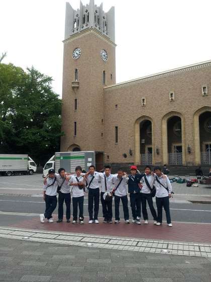 ご存知早稲田の森にそびえているのは早稲田大学です。早くも班別研修を終えたグループが集合です。ちなみに,集合は午後6時30分だったのでは・・・・?