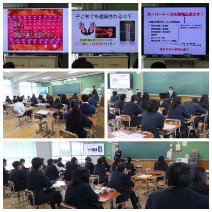 3時間目に、2年生で「薬物乱用防止教室」を行いました。南警察署のスクールサポーターの方に来ていただき、薬物の危険性について話をしていただきました。「自分には関係ない」と思っていても、実は身近なところにあるのだということを知り、少し自分事として捉えられたのではないでしょうか。