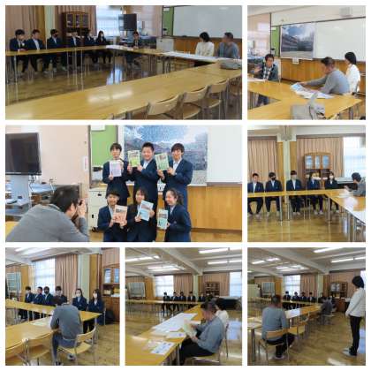 本日、京都新聞社の方が来校され、本校で取り組んでいる「カレンダー配付」の取材をされました。今回は、この取組の中心となった文化委員長や生徒会役員と担当の先生方が取材を受けました。