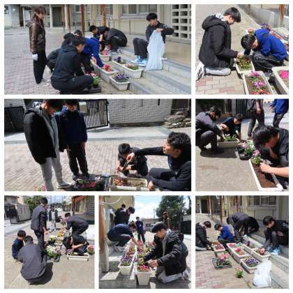新年度を迎えるにあたり、正門付近にあるプランターの植え替えをしました。