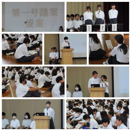 議長の進行で、生徒会執行委員から昨年度の決算報告や今年度のスローガンなどが報告されました。また、各委員会からは今年度の活動目標や計画が提案されました。