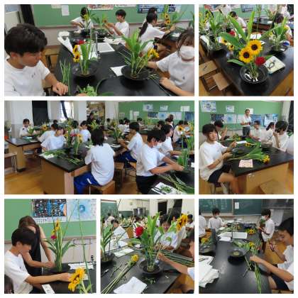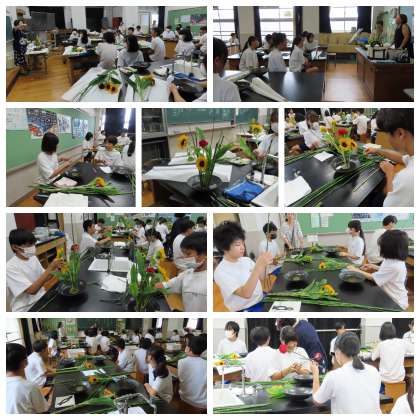 講師の方から花や活け方の説明を聴いた後、カーネーションやヒマワリなど、それぞれに割り当てられた花で活け花に取り組んでいました。それぞれが、こだわりや工夫を凝らして、自分の作品を完成させていました。