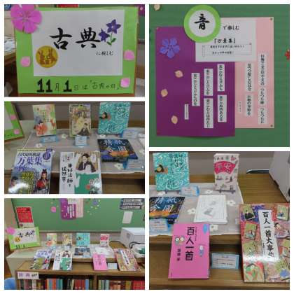 図書室には、古典の日にちなんださまざまな本が展示されています。「枕草子」や「徒然草」「百人一首」など、みなさんが学習した作品に関する本も展示されていますので、ぜひ図書室に足を運んで、古典に親しんでください。