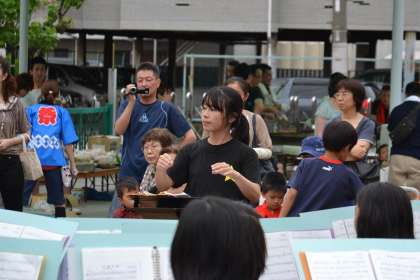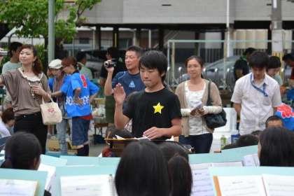 今日の共栄保育園の夏祭りは,生徒たちの指揮によるものでした。少々緊張気味でしたが,4人の3年生が指揮に挑戦しました。楽器を演奏するのとは,少し勝手が違うようですが,なかなかどうして,気分は佐渡さんです。
