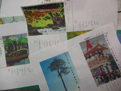 実は,昨年度のいきいきトークの時,内モンゴルの学校での支援の事を話され,それに対して,本校の生徒が女川第1中学校との交流の話を返し,その時に贈った絵葉書の説明をしたらしいのです。その女性は,このはがきをモンゴルの学校へ持って行ってプレゼントする事を約束され,留学生に頼んで絵葉書に俳句の訳を頼み,モンゴルの言葉で翻訳したのだそうです。