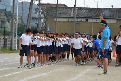 全校生がグランドに集合してムカデのスターと準備です。第1走の1年生女子,相当なプレッシャーのようです。3年生はさすがの表情。