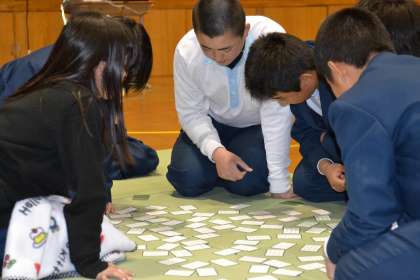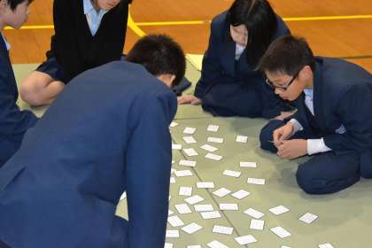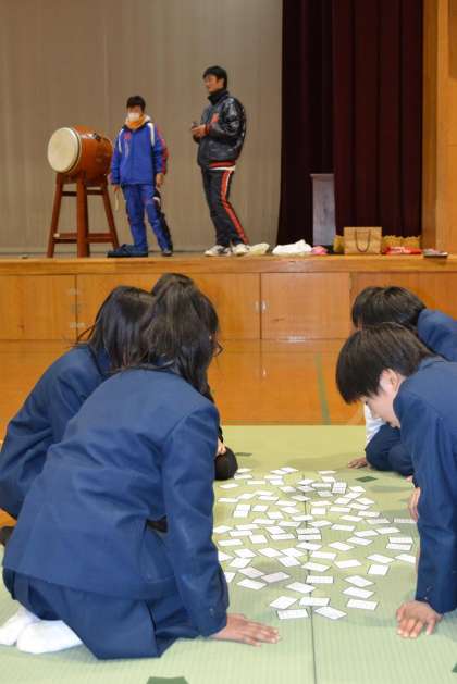 昨日の2年生に引き続き,今日の午後は1年生の百人一首大会が行われました。予報通り暖かな気候となり春を感じる柔らかな日差しです。体育館では,1年生の先生方が代わる代わる読み札を読み,それぞれの個性がでた楽しい調子で盛り上がっていました。