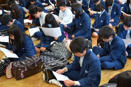 3年生は最後の昼食を終え,5時間目には明日の公立試験に備えての集会が行われました。校長先生からの激励,加藤先生からの諸注意がありました。今回が始めての受験という人もいますが,ほとんどが2回目以上,とはいえやはり緊張しますよね。