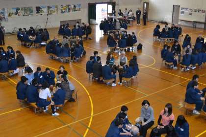 今日は暖かな一日となりました。ぽかぽかと春の日差しが体育館に差し込み,11回目のいきいきトークが開催されました。元気一杯の1年生ですが,地域の大人の人と三角形になり,トークが始まると,熱心に話をしていました。みんな本当に話したいのですね。「中学生は話さなくて・・・・」と良く聞きます。でも,本当は本音で話をしたいのですよね。