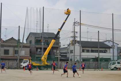グラウンドのネットの改修工事も大詰めを迎えました。東面のネットを張る作業を終え,今日は北面のネットを張る作業になりました。これがまた早い。もう少しで完成です。体育の授業も,もちろん安全第一です。