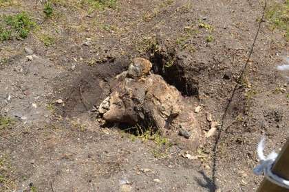 暖かな日差し,綺麗に着飾った花たちを鑑賞していたのですが,ふと畑に目をやると「うわぁ!」という物に出会いました。ここは,5組の生徒が畑として野菜を育てていたり,この前はFS(フィールドサイエンス)部が整備をしていた場所です。そこになにやら埋もれているのです。埋もれていると言うより,顔を覗かせていると言った方がいいのかも知れません。見れば木の根っこです。明らかに掘ろうとしている途中です。かつてここに木があって畑・花壇にするときに伐採された木の根っこのようです。畑に開墾するのに邪魔になったため,FS部が掘り起こしを決意したようです。