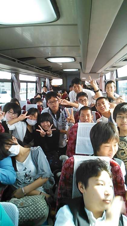 早くもレポートが届きました。空港へ向かうバスの中の様子です。2台のバスで空港へ向かっているのですが,名神高速の吹田付近で,事故のため渋滞しているとの情報が入り,ルートを第2京阪に変更した模様です。無事に,遅れなく到着しますように。