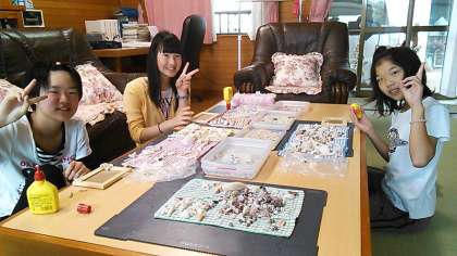 「アンちゃんチームは、朝ビーチでとった貝殻で写真のフレームを作っていました。」