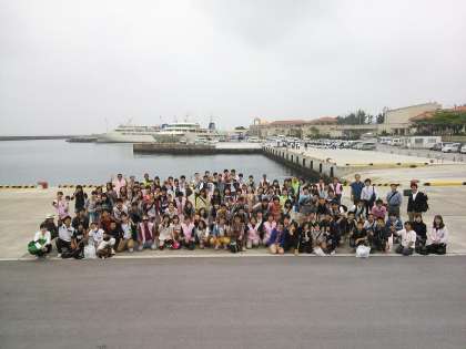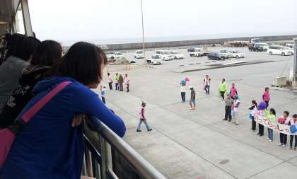 写真の中で,島の人たちが「さようなら」ではなく「いってらっしゃい」の横断幕を掲げてくださっているのが印象的でした。