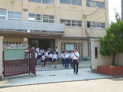 2年生は,インフルエンザの流行によって延期されていた校外学習に,いよいよ出発です。これでもかという好天に恵まれ,朝から体育館に元気な声が響いていました。