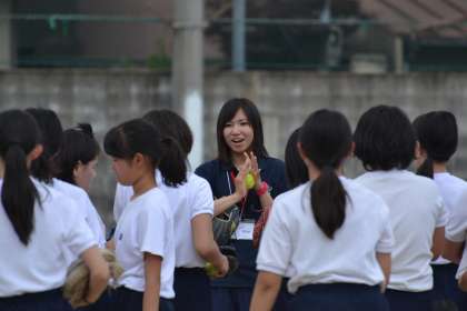 先日,プリントでもお知らせをしましたように,今週から体育科で教育実習生が頑張っています。3週間に渡って,教科や学級活動など,実際の学校現場で学習していきます。今日から,実際に授業を受け持っています。先生の専門はソフトボールだそうです。ちょうど今からの女子の体育がソフトボールの学習となります。