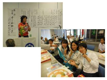 今年の標語のテーマは「ありがとう」です。毎年全校で募集をして応募しています。今年度も2名が入選,7名が佳作に選ばれました。表彰式に先だって,南区推進委員会が行われ,「チーム和ーク」と題して,シドニー五輪で銀メダル(選手),北京五輪ではコートとして金メダルに輝いた,女子ソフトボールチームである田本選手(現京都市立中学校教諭)がジャパンのユニホームに身を包み,講演をされました。そして,本校からは3名の代表が表彰を受けました。