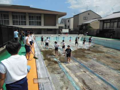 お盆明け,野球の試合や柔道部の全国大会が終わり,学校は部活動や宿題の質問,学習会に参加する生徒が登校してきます。いよいよ夏休み明けの授業が始まるのだなという感じがしてきます。今日は午後から,女子バレー部と柔道部がプール掃除を手伝ってくれました。昨年までは七月までにプール掃除を終え,梅雨時からプール学習が始まります。でも,最近の天候を見た時,確かに夏は異常に暑いのですが,梅雨時が異常に寒いのです。プールから上がる生徒が,唇を真っ青にしている姿がありました。そこで,今年は残暑が厳しい夏休み明けからのプール学習をやってみようとの試みです。ちゃくちゃくと準備が進んで行きます。