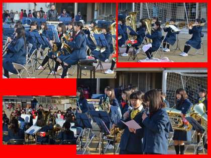 今日は,唐橋小学校で開催されている唐橋子どもまつりのオープニングに,本校の吹奏楽部が招かれて演奏をさせていただきました。行程には早くから,たくさんの小学生が詰めかけ,始まりを待っていました。部員の保護者やOGも聞きに来てくれました。吹奏楽の楽器は,金属を使用したものが多いため,気温が低いこの時期は,楽器が冷えてしまい,音程が安定しなくなります。それでも部員たちは,笑顔を忘れず,一生懸命に演奏していました。