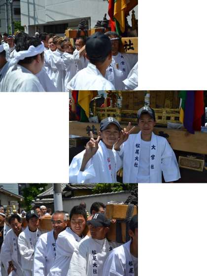 5月11日(日)松尾大社の祭礼「おかえり」に、今年も本校生徒と共に参加させていただきました。御旅所から西大路通りを南下してきた神輿を、西大路駅付近で待って、一緒に西寺公園を目指しました。春季大会を終えた生徒たちは、白装束に身を包み、お借りしたハッピを上からまとい、大宮社の方々と一緒に神輿を担がせていただきました。