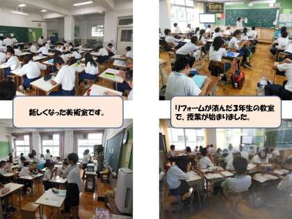 北校舎の1階(3年生)と、東校舎の1階に移転した美術室、職員室、校長室、事務室のリフォームが一応完成し、引っ越しを済ませ、授業が始まりました。夏休み中にプール掃除を行ってきれいになったプールの授業も始まりました。
