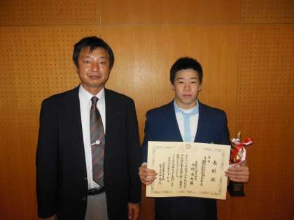 11月7日(金)の夕方、京都市総合教育センター4階の永松ホールにて、平成26年度の京都市中学校体育表彰表彰式が開催されました。これは、京都市内の中学校で、本年度の夏季大会(近畿大会・全国大会)にて、優勝な成績を収めたチームや個人を表彰するものです。本校からは柔道部3年生が全国大会で個人第2位に輝き、表彰を受けることとなりました。教育長、校長会会長先生、中体連会長先生からもお祝いの言葉をいただきました。みんな競技者としてはまだまだこれからです。長く競技に関われるよう、体も心も、なお一層鍛えてほしいと思います。