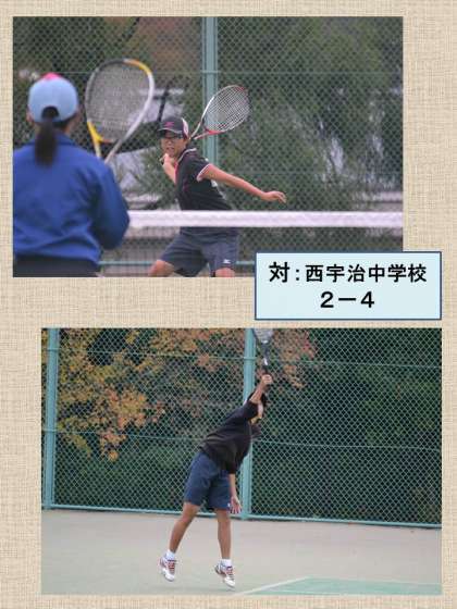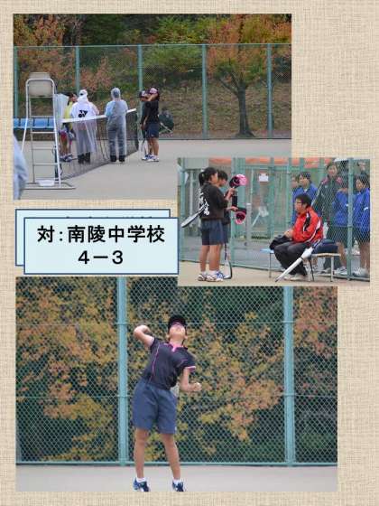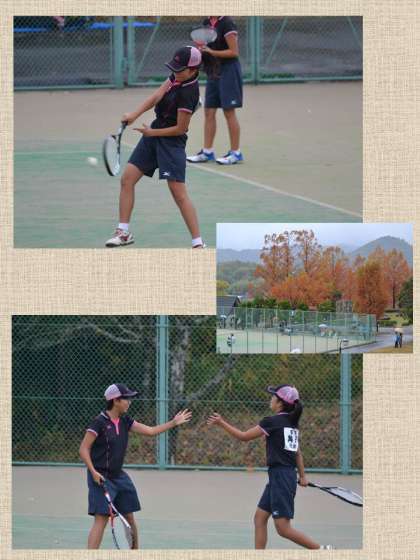 第1試合は南陵中学校との対戦です。試合は互角。フルセットまでもつれ込み,何とか逃げ切りました。次の第2試合を取れば,近畿大会への出場が決まります。何とかものにしたいもの。でも相手ペアも思いは同じです。結果は2−4と敗れてしまいました。でも決してセット数ほど実力は開いていないと思いました。ほぼ互角の戦いを進めて行ったのですが,この一本というところの粘りというか集中力というか,そんなものが勝負を分けた様に思います。