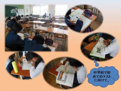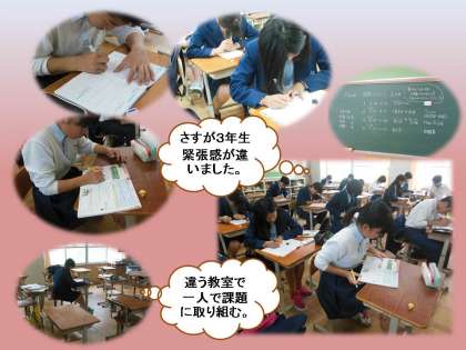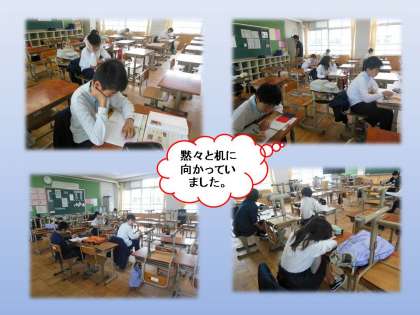 来週,月曜日と火曜日に行われる定期テスト1に向けて,今日は土曜学習会が行われています。三学年とも,本当に集中して机に向かっています。特に3年生は「さすが」と言いたくなるほど緊張感を持って課題に向き合っていました。2年生の時とはやはり表情が違います。なんだか頼もしく見てきました。