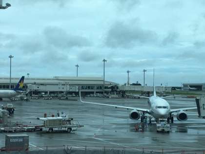 那覇空港に到着しました。雨は上がっているようですが、蒸し暑いそうです。