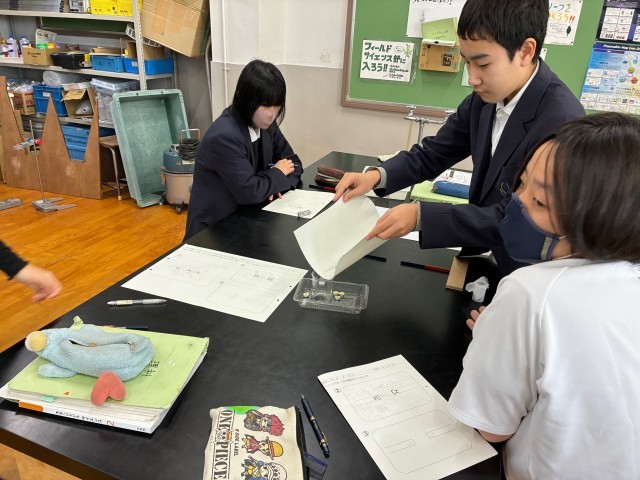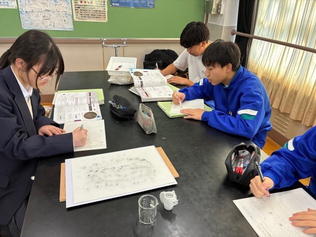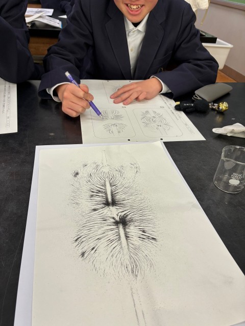 2年生理科の実験で磁石のまわりの磁界の様子をしらべました。磁石の上に置いた紙の上に鉄粉をふりかけ,振動を与えると模様が浮かび上がってきます。みんなていねいにスケッチをしていました。