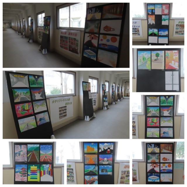 中校舎1階の廊下に、3年生が美術の時間に描いた絵の作品が展示してあります。