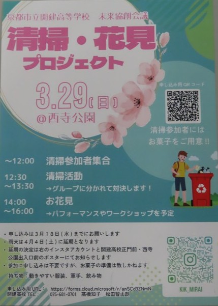 3月29日(日)12:30 から、開建高校主催の「清掃・花見プロジェクト」が開催されます。