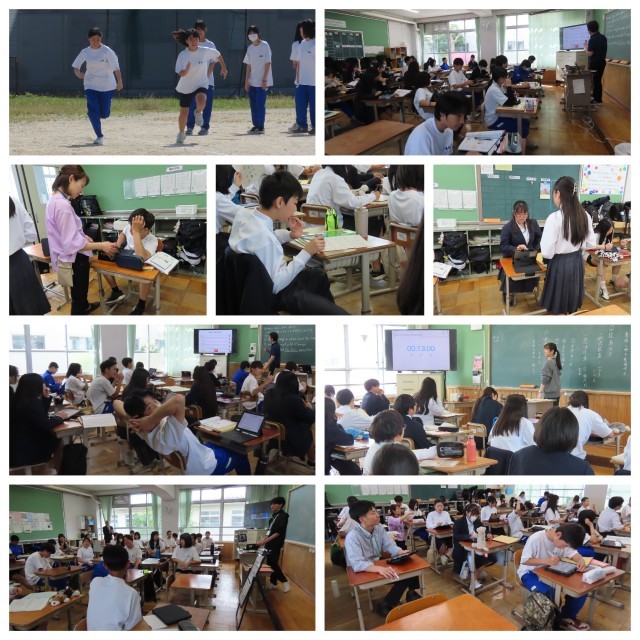 2年生では、数学の計算問題や新体力テスト(50m走・ハンドボール投げ)、英語の未来形の学習をしています。自分で作った文章を使って、ペアやグループで会話をしながら、英語力を身に付けています。